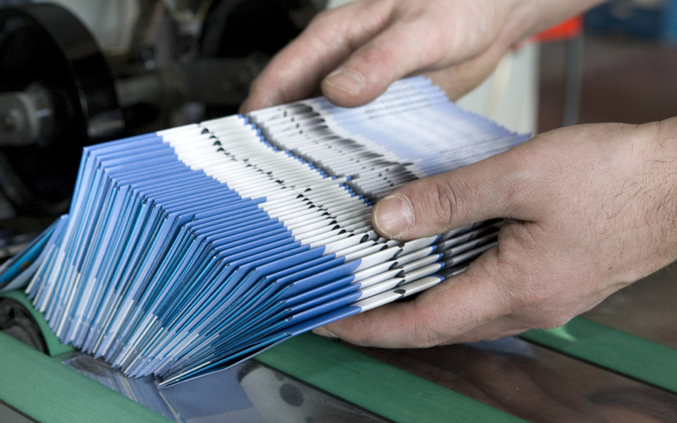 Auf Wunsch befüllen wir Ordner und Mappen, falzen und kleben Ihre aufwendige Präsentationsmappe, befestigen Ihre Warenprobe passgenau und leimen Datenschieber und PopUp.